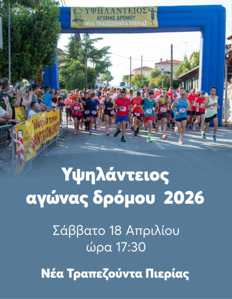 O Μορφωτικός Ποντιακός Σύλλογος Νέας Τραπεζούντας Πιερίας “Αλέξανδρος Υψηλάντης” με την υποστήριξη του ΑΠΣΔ Πιερίας “ΖΕΥΣ” διοργανώνει το Σάββατο 18 Απριλίου 2026, στις 17:30 τον “ΥΨΗΛΑΝΤΕΙΟΣ ΑΓΩΝΑΣ ΔΡΟΜΟΥ 2026” 10 χλμ και αγώνα 1100 μέτρων για μαθητές και μαθήτριες Δημοτικού και Γυμνασίου στη Νέα Τραπεζούντα Πιερίας.