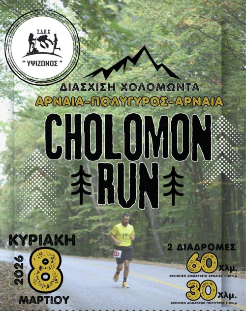 Ο Σύλλογος Δρομέων Περιπατητών Χαλκιδικής “Υψίζωνος” διοργανώνει την Κυριακή 8 Μαρτίου 2026 τους αγώνες δρόμου “2ο CHOLOMON RUN”, 30 και 60 χιλιομέτρων στην περιοχή του όρους Χοιλομών με αφετηρία το δημαρχείο της Αρναίας για τον αγώνα των 60 χλμ και για τον αγώνα των 30 χλμ αφετηρία από το δημαρχείο Πολυγύρου και τερματισμό στο δημαρχείο Αρναίας του νομού Χαλκιδικής.